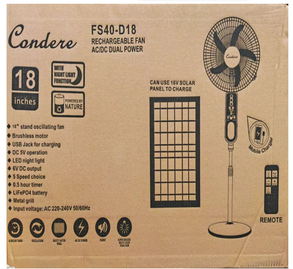 Condere 18" Solar Rechargeable Stand Fan FS40-D18
