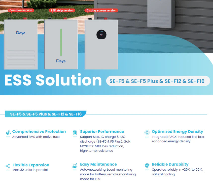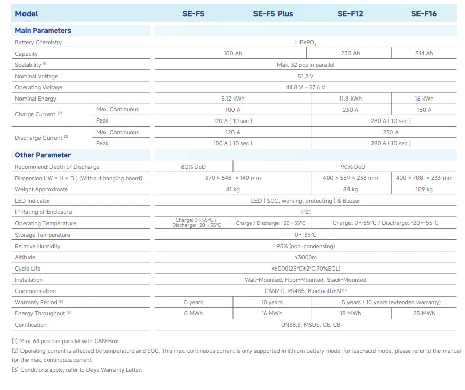 The Deye SE-F5 Battery is a premium lithium iron phosphate (LiFePO₄) energy storage unit engineered for residential and commercial energy systems. With a nominal capacity of 5.12kWh and 51.2V, it delivers reliable performance, advanced safety features, and flexible scalability.