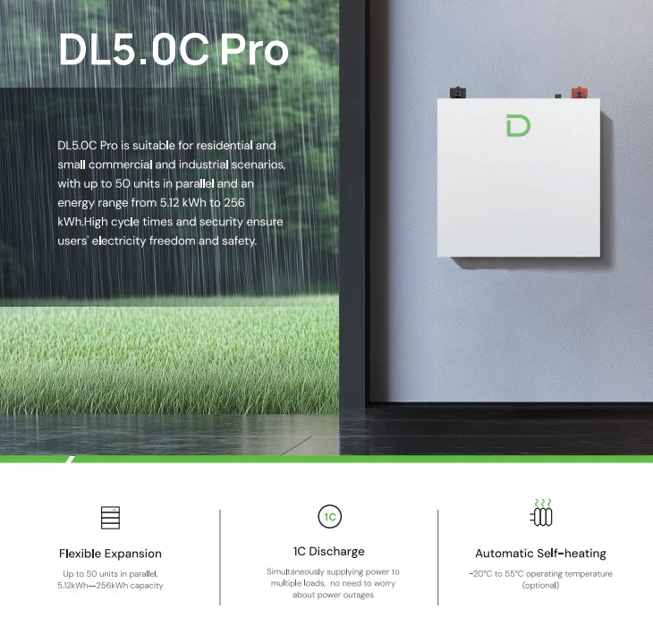 The DL5.OC Pro is suitable for residential and small commercial and industrial scenarios, with up to 50 units in parallel and an energy range from 5.12 kWh to 256 kWh.High cycle times and security ensure users' electricity freedom and safety.