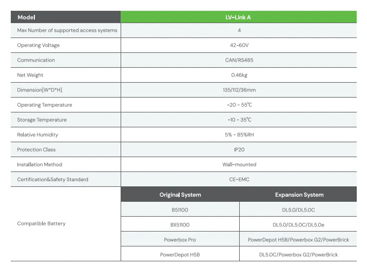 - The LV-Link A allows different generations of compatible Dyness LV batteries (such as the BX series and newer DL series) to be used together in the same system.